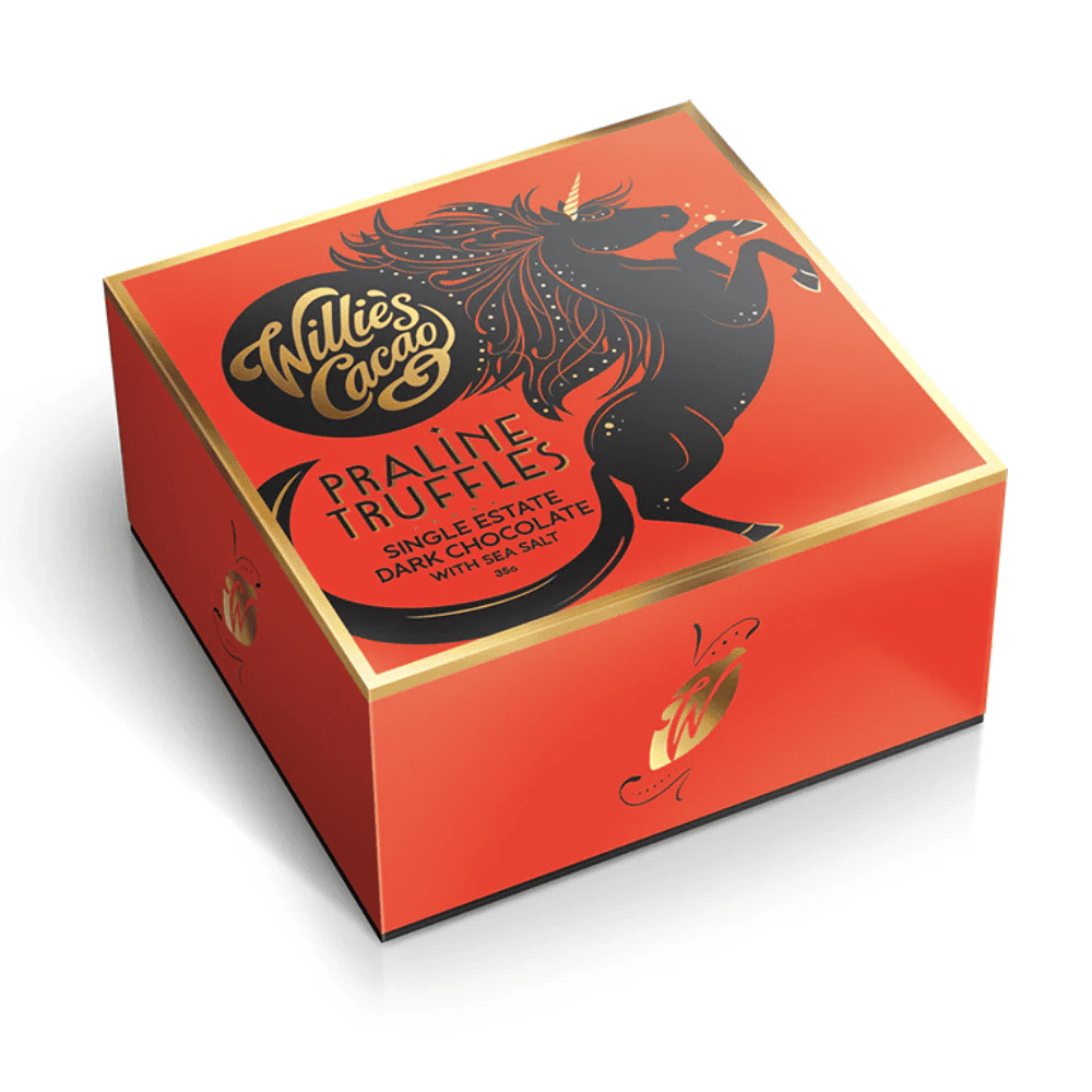 A 35g box of Dark Chocolate Sea Salt Truffles, red and gold with a black rearing unicorn on the lid, containing single estate dark chocolate with sea salt.