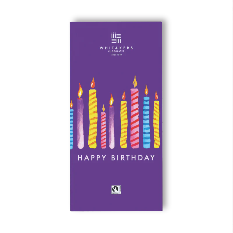 The Gluten Free Happy Birthday Milk Chocolate Bar (90g) has a purple wrapper with colourful, lit birthday candles and "Happy Birthday" in white text—an ideal gluten free treat for celebrating special occasions.