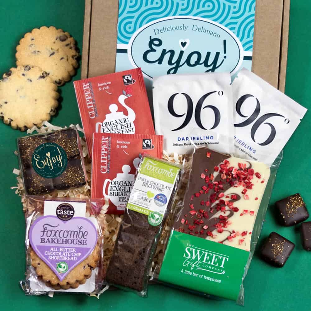 The perfect gift for a chocolate & tea lover! This letterbox friendly gift is the perfect excuse to enjoy a quiet moment with a warming cup of tea accompanied by truffles, chocolate chip shortbread, a brownie and a handmade strawberries & cream Belgian chocolate bar.