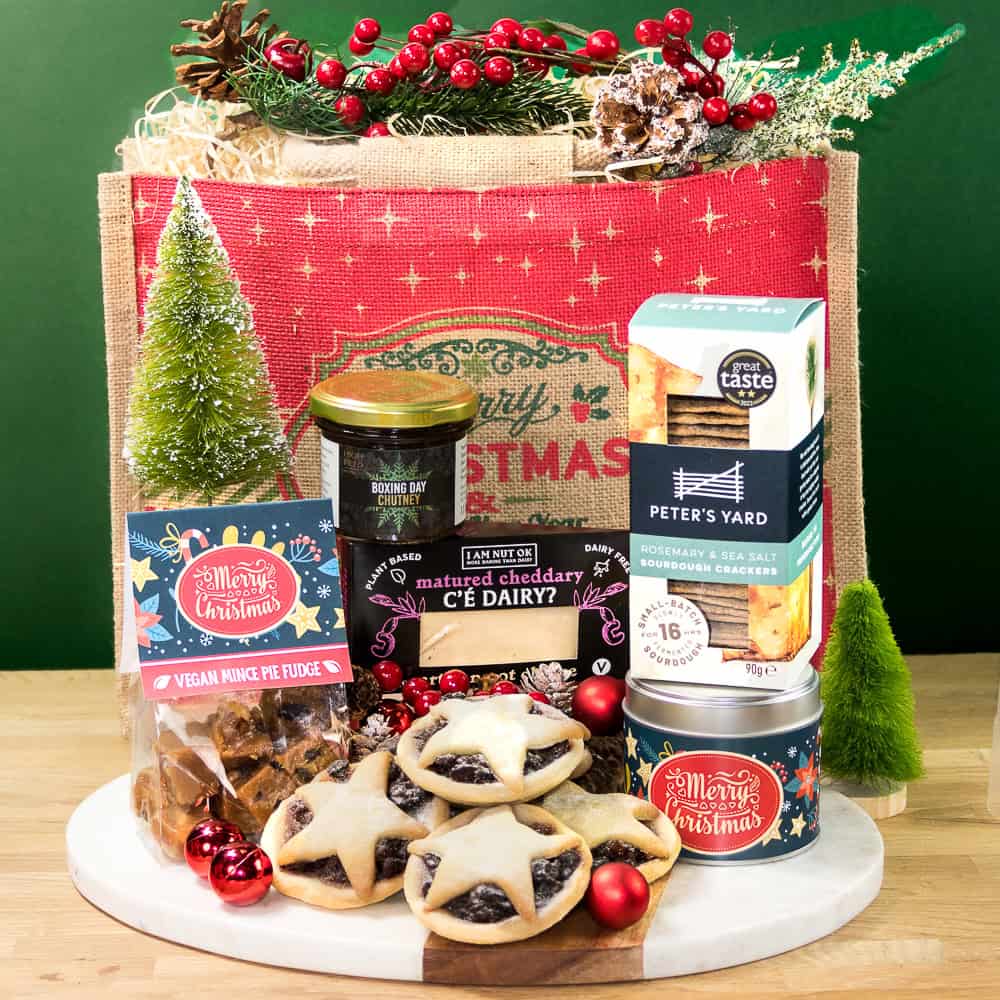 Indulge in one of our wonderful vegan Christmas hampers to raise a glass and toast the festivities. The Vegan Merry Christmas Gift Hamper includes vegan mince pies, festive fudge, vegan cheese, Christmas chutney, rosemary crackers & vanilla shortbread. A delicious vegan festive feast! What are you waiting for? Eat, drink and be merry!
