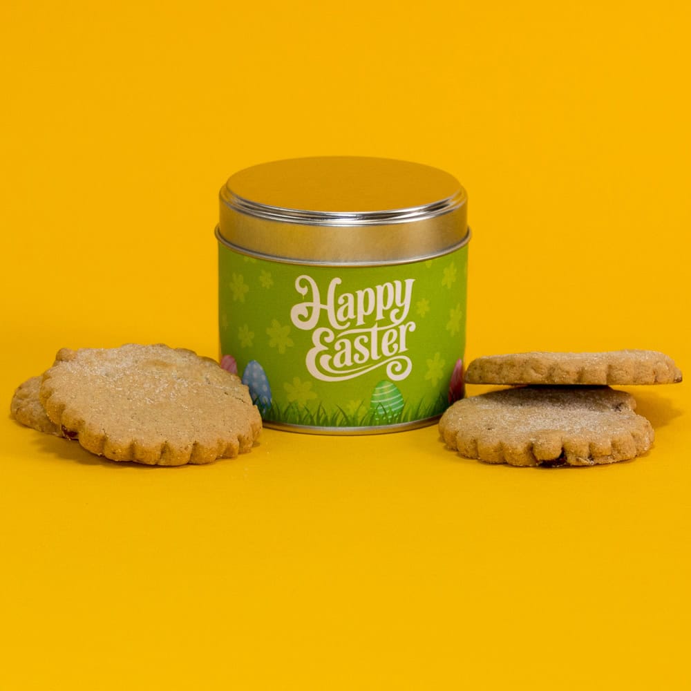 4 delicious Easter biscuits handmade in Devon with spices & currants. Packaged in a reusable Easter tin.
