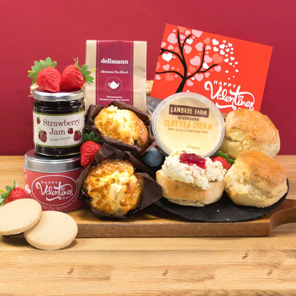 Includes 2 plain Devonshire scones, freshly baked on the morning of dispatch with Devon clotted cream, strawberry jam & West Country tea. Enjoy with all butter Devon shortbread packed in a reusable Valentine’s tin and a choice of Victoria, lemon & white chocolate or rich chocolate muffins. Delicious!