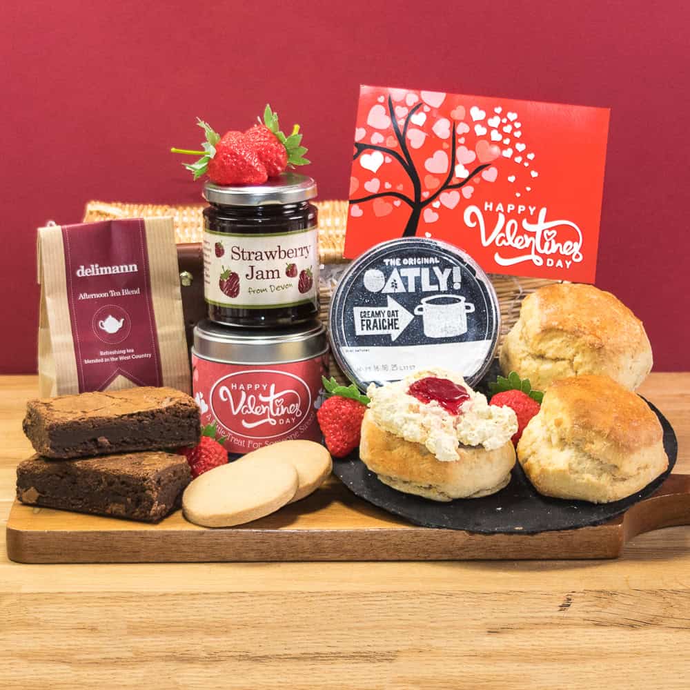 Includes 4 vegan Devonshire scones, Creamy Oatly Creme Fraiche and our extra fruity strawberry jam. Enjoy with our signature Delimann tea, 2 rich chocolate vegan brownies and vegan vanilla shortbread in a reusable Valentine’s tin.